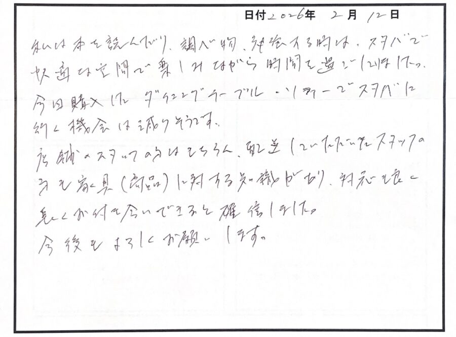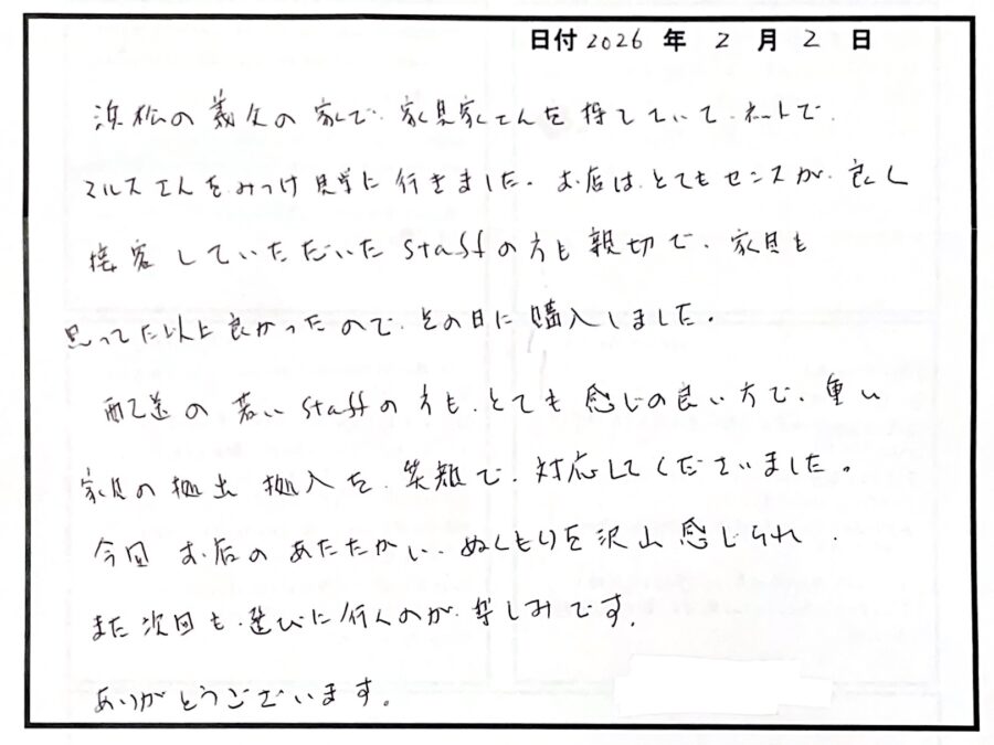 S様、素敵なお手紙ありがとうございます!「友達と一緒に探しているようだった」とても嬉しい言葉です。是非また一緒に、楽しく家具選びしましょう!