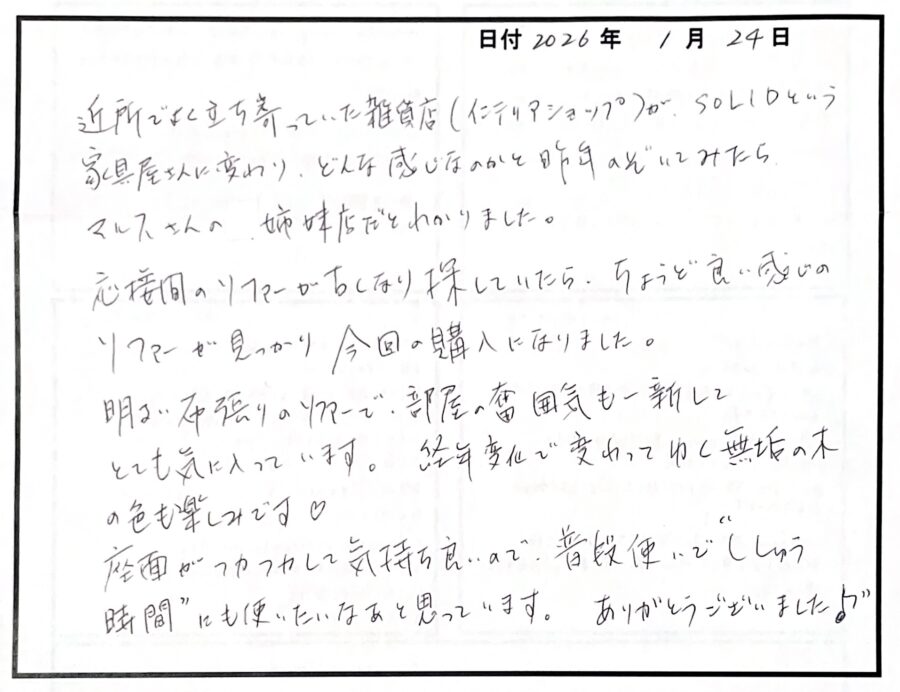 お手紙書いていただいただけではなく、渡しにご来店くださりありがとうございました。またお会いできとても嬉しかったです。お選びいただいたソファベンチで、普段の生活がより楽なものになりますように。ご夫婦の時間をゆったりとお過ごしください。