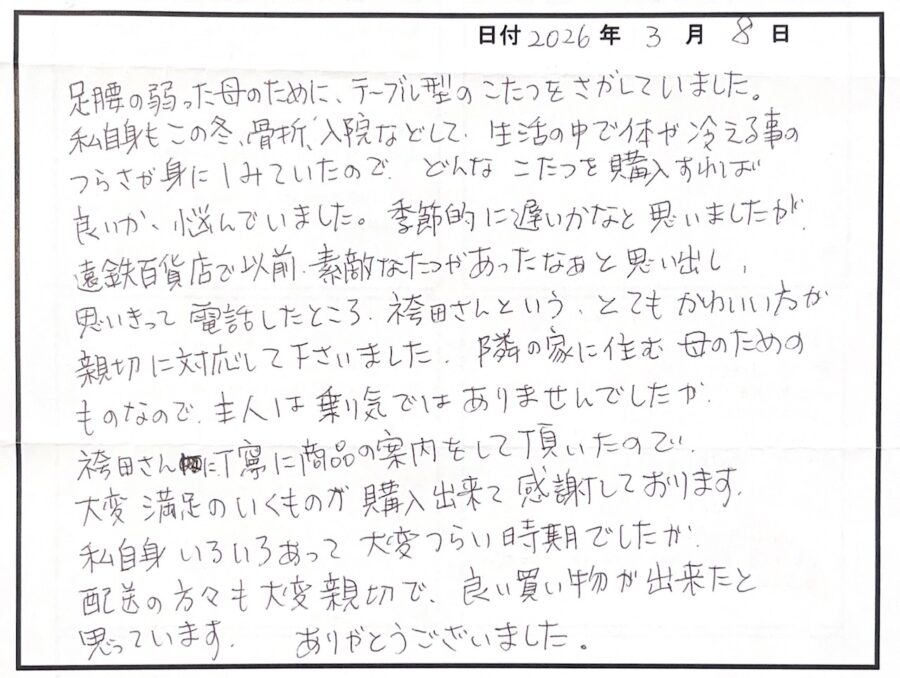 お選びいただいたこたつを、お母さまと共に心地よくお過ごしいただければ幸いです。