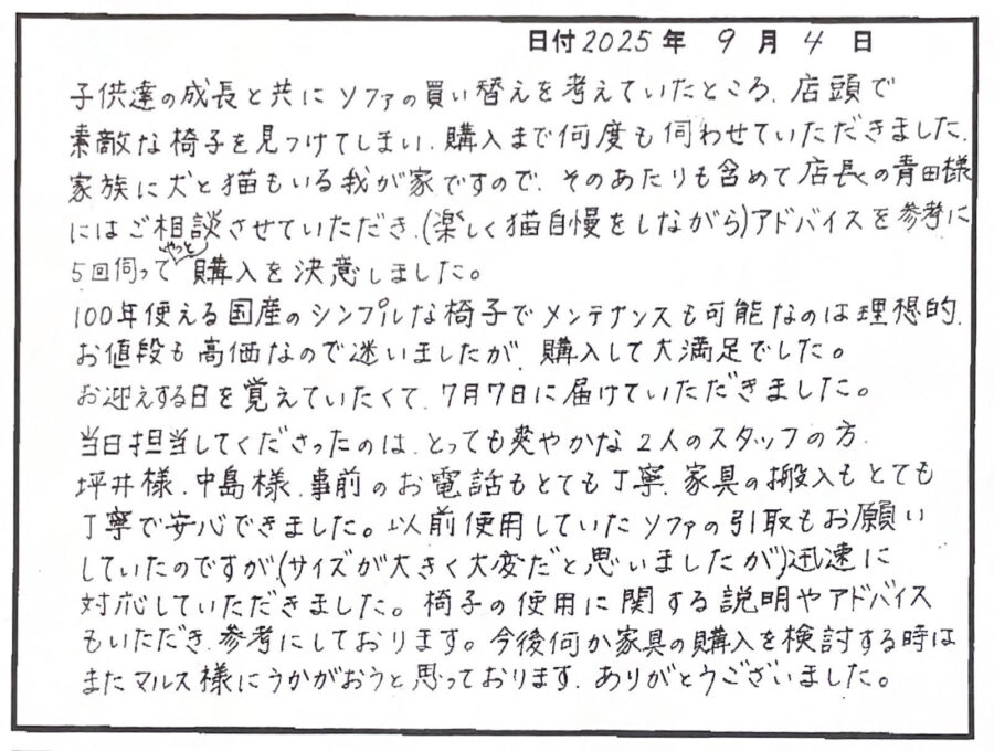 ご来店時S様のことをたくさん教えていただき、S様にぴったりの家具選びのお手伝いができたこと、私もとても嬉しく存じます。