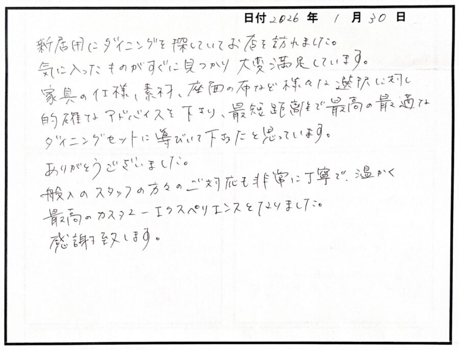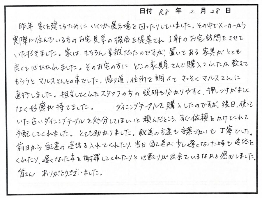 お宅見学で当店を知っていただいたこと、I様と素敵な家具とのご縁を紡げたこと、大変嬉しく思います。