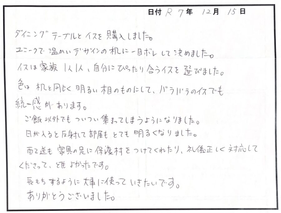 Y様、この度はダイニングセットをご購入くださり、誠にありがとうございます。