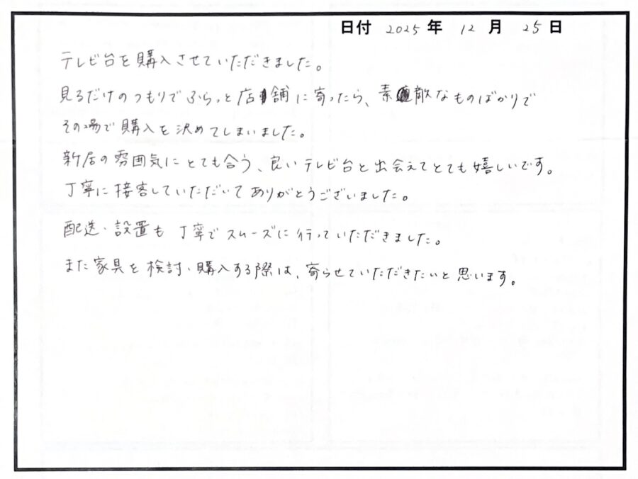 K様、この度はテレビボードをご購入いただきまして誠にありがとうございます。